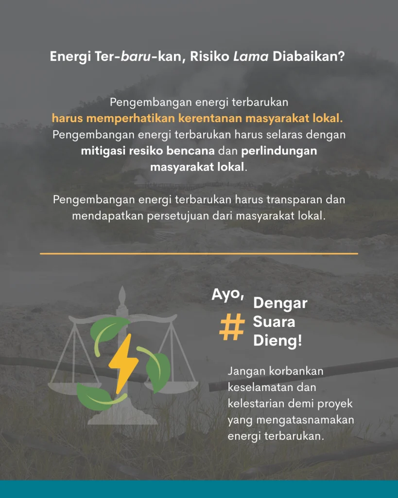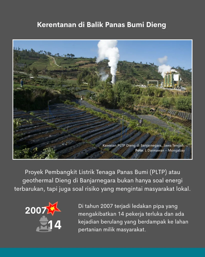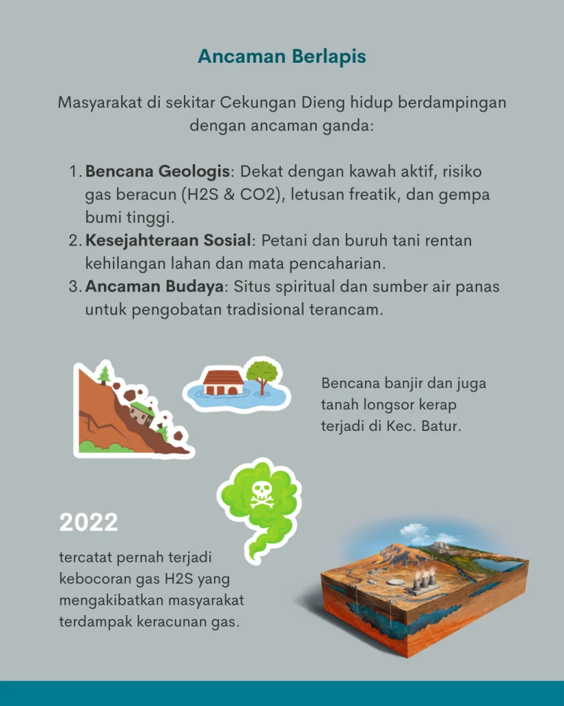 Proyek Pembangkit Listrik Tenaga Panas Bumi (PLTP) atau geothermal Dieng di Banjarnegara bukan hanya soal energi terbarukan, tapi juga soal risiko yang mengintai masyarakat lokal.